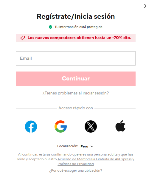 Lo primero que debes hacer es descargar AliExpress en tu celular o ingresar a la página web. Luego tienes que crear una cuenta. Para ello, debes llenar un formulario ingresando algunos datos personales o, en todo caso, bloguéate desde alguna de tus cuentas de redes sociales como Facebook o Google.